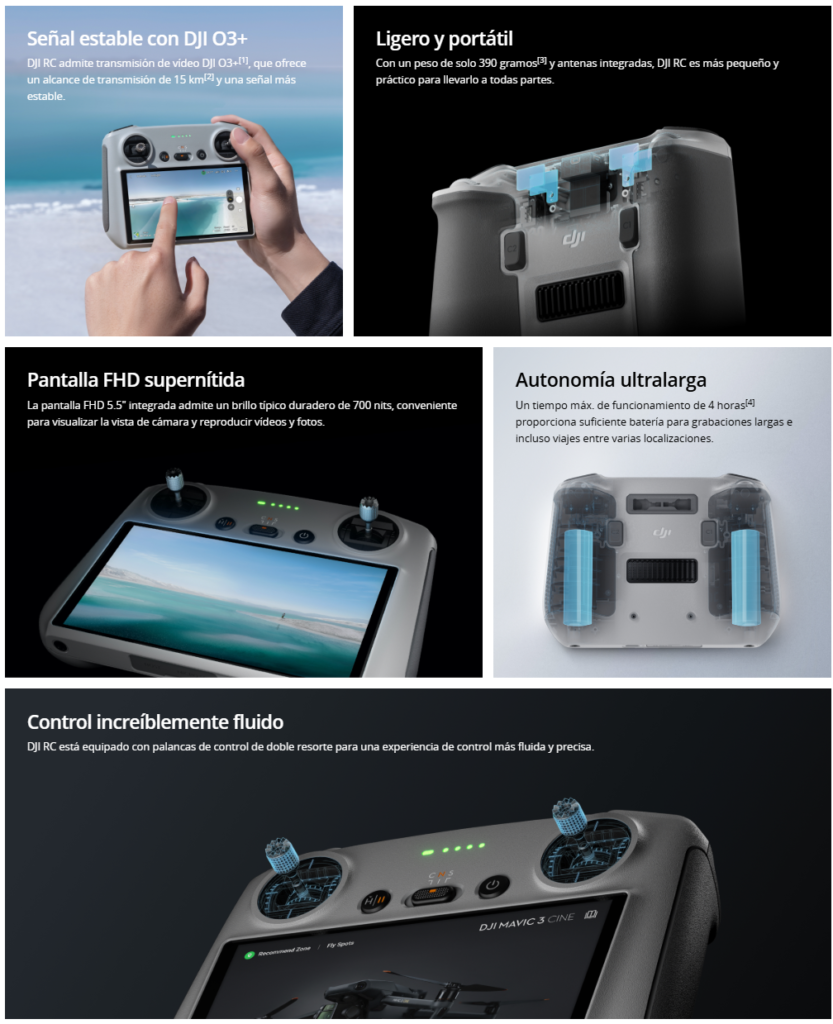 El DJI RC redefine el control de vuelo con su diseño ligero, pantalla FHD integrada y batería de larga duración. Equipado con palancas de doble resorte para mayor comodidad y compatible con la avanzada transmisión de vídeo DJI O3+, ofrece una transmisión en directo fluida en 1080p/60 fps y un alcance de hasta 15 km. Ideal para drones como el DJI Mavic 3, el DJI RC garantiza vuelos estables y un control intuitivo, permitiéndote capturar contenido aéreo con precisión y facilidad.