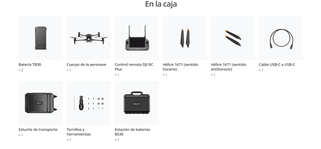 El Matrice Serie 30 (M30 o M30T) incluye un DJI RC Plus, dos baterías de vuelo inteligentes TB30, una estación de baterías inteligentes BS30 y el estuche de almacenamiento de la aeronave.