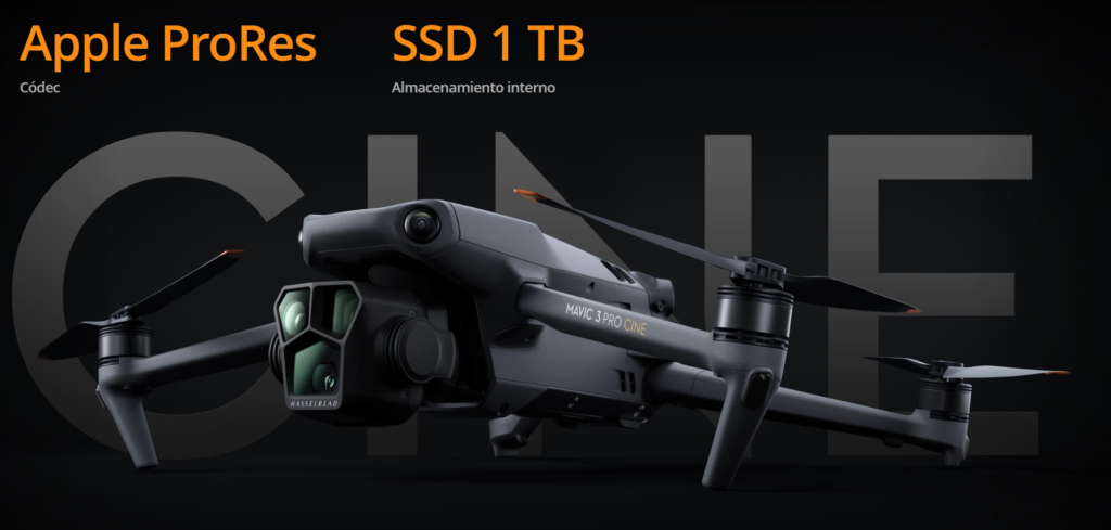 Mavic 3 Pro Cine ofrece numerosas opciones para los creadores profesionales. Las tres cámaras admiten codificación Apple ProRes 422 HQ, ProRes 422 y ProRes 422 LT. Además, cuenta con una SSD de 1 TB integrada y un cable de datos de alta velocidad de 10 Gb/s para facilitar aún más la creación profesional.