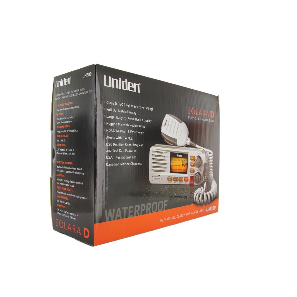 El Uniden Solara D UM380 es un radio marino de montaje fijo potente y compacto que está listo para ser instalado a bordo. Puede transmitir en canales marinos de EE. UU., Canadá e internacionales a 1 o 25 vatios de potencia y cuenta con capacidad para llamada selectiva digital de clase D (DSC).